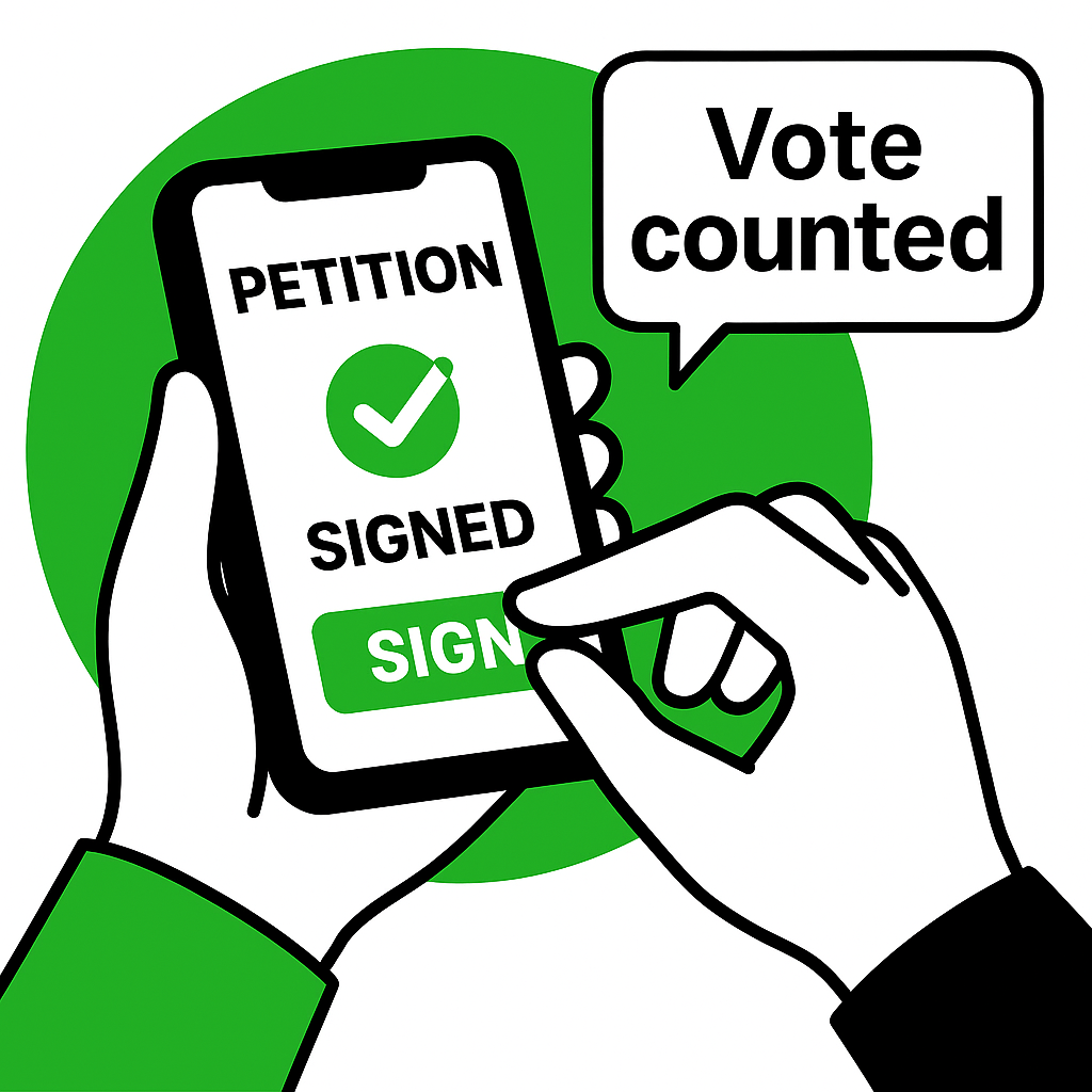 /Collection: /by davooda/Type: PNG/Illustrative graphic showing a hand holding a smartphone displaying a petition confirmation. Ideal for campaigns promoting voter engagement and digital activism.