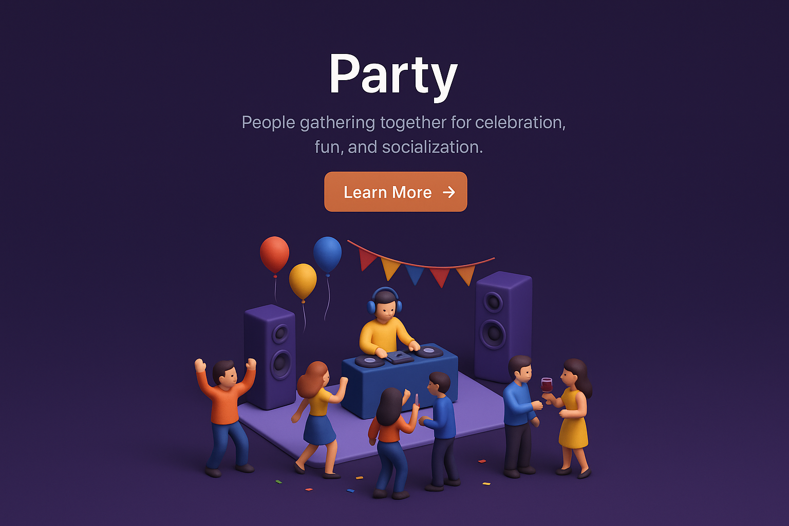 A lively 3D scene depicting a party from a bird's eye perspective, featuring guests enjoying themselves, a DJ, and colorful decorations.
