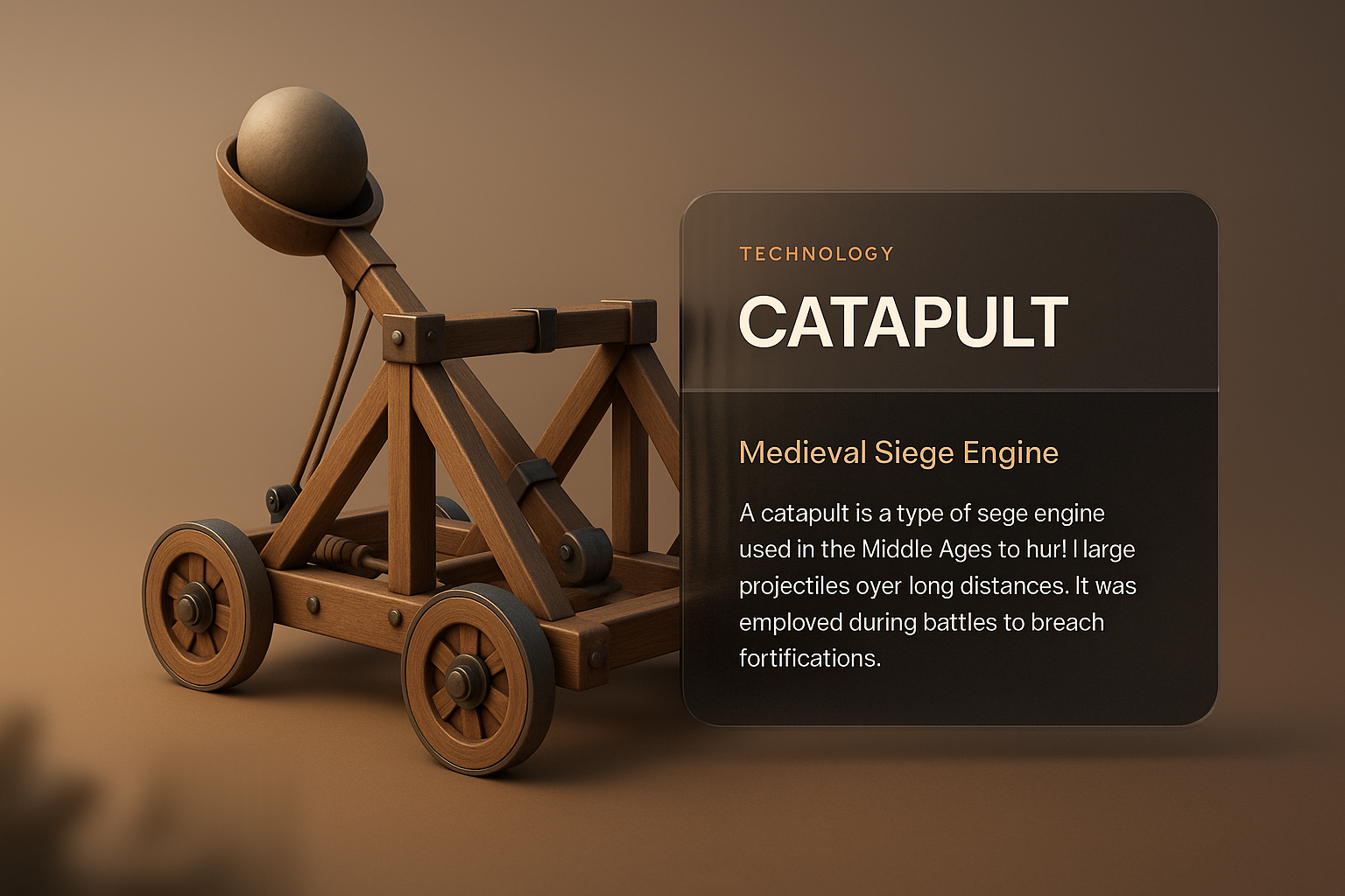 A detailed 3D illustration of a wooden catapult with an integrated dark information panel, showcasing its historical significance as a siege engine.