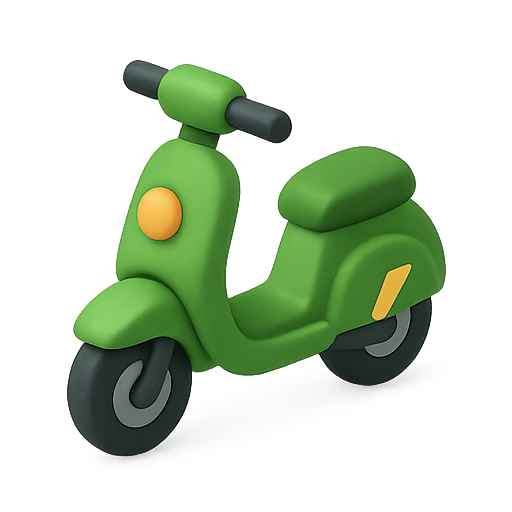 A cheerful 3D illustration of a green scooter designed with a playful aesthetic, suitable for children's content, apps, or marketing materials.