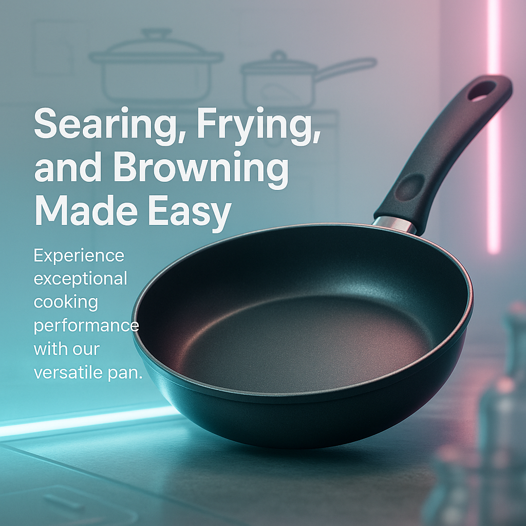 /Collection: /by davooda/Type: PNG/Promotional image showcasing a sleek cooking pan with a modern aesthetic, ideal for kitchenware marketing. The design emphasizes ease of use and versatility, appealing to cooking enthusiasts.