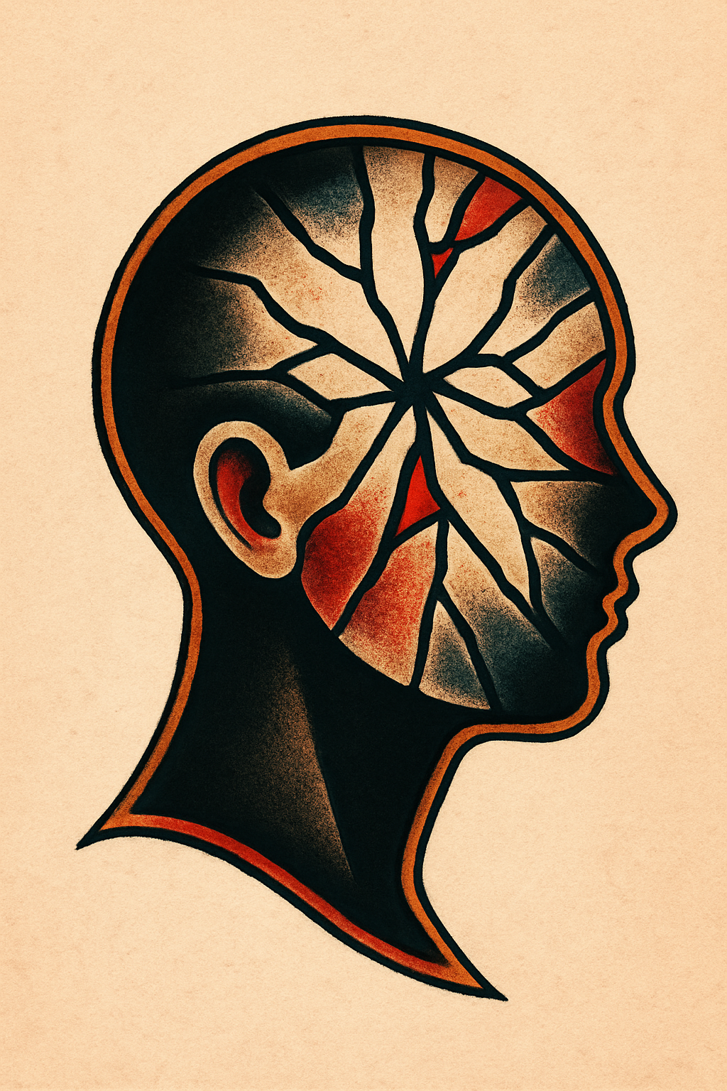 A striking silhouette of a head resembling a shattered mirror, featuring cracks and vibrant colors. The design is set against a subtle beige background, showcasing a classic tattoo style.