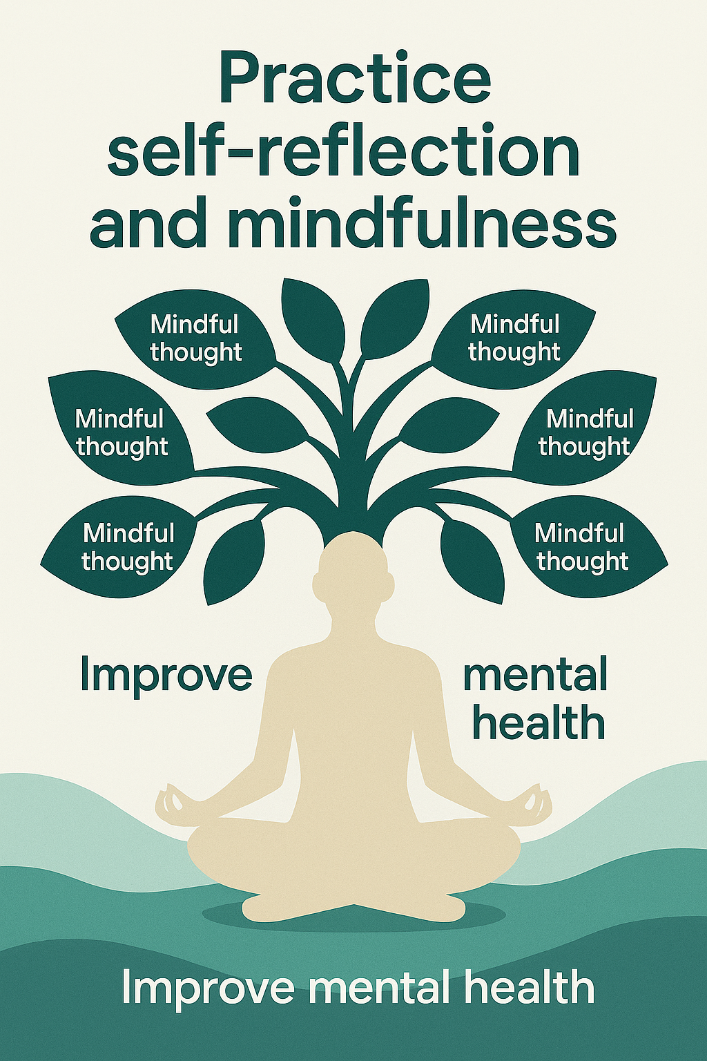 /Collection: /by davooda/Type: PNG/Illustrative graphic promoting mindfulness and self-reflection as tools to improve mental health, featuring a calm figure and tree-like design elements.