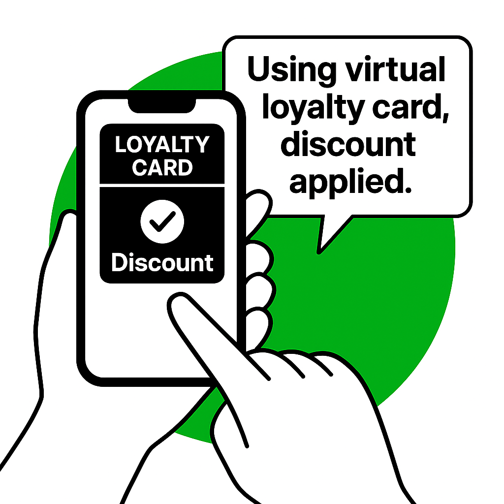 Modern illustration depicting a hand interacting with a smartphone displaying a virtual loyalty card and discount notification, ideal for digital marketing materials.