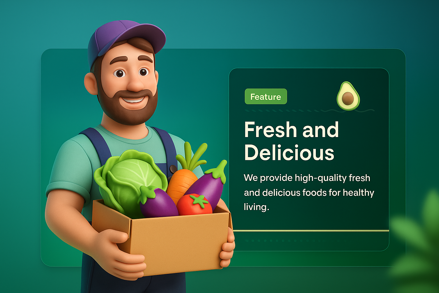 /Collection: /by davooda/Type: PNG/A cheerful man with a beard is holding a box filled with colorful fresh vegetables, set against a smooth gradient background. The scene features a modern design with a feature block highlighting the quality of the produce.