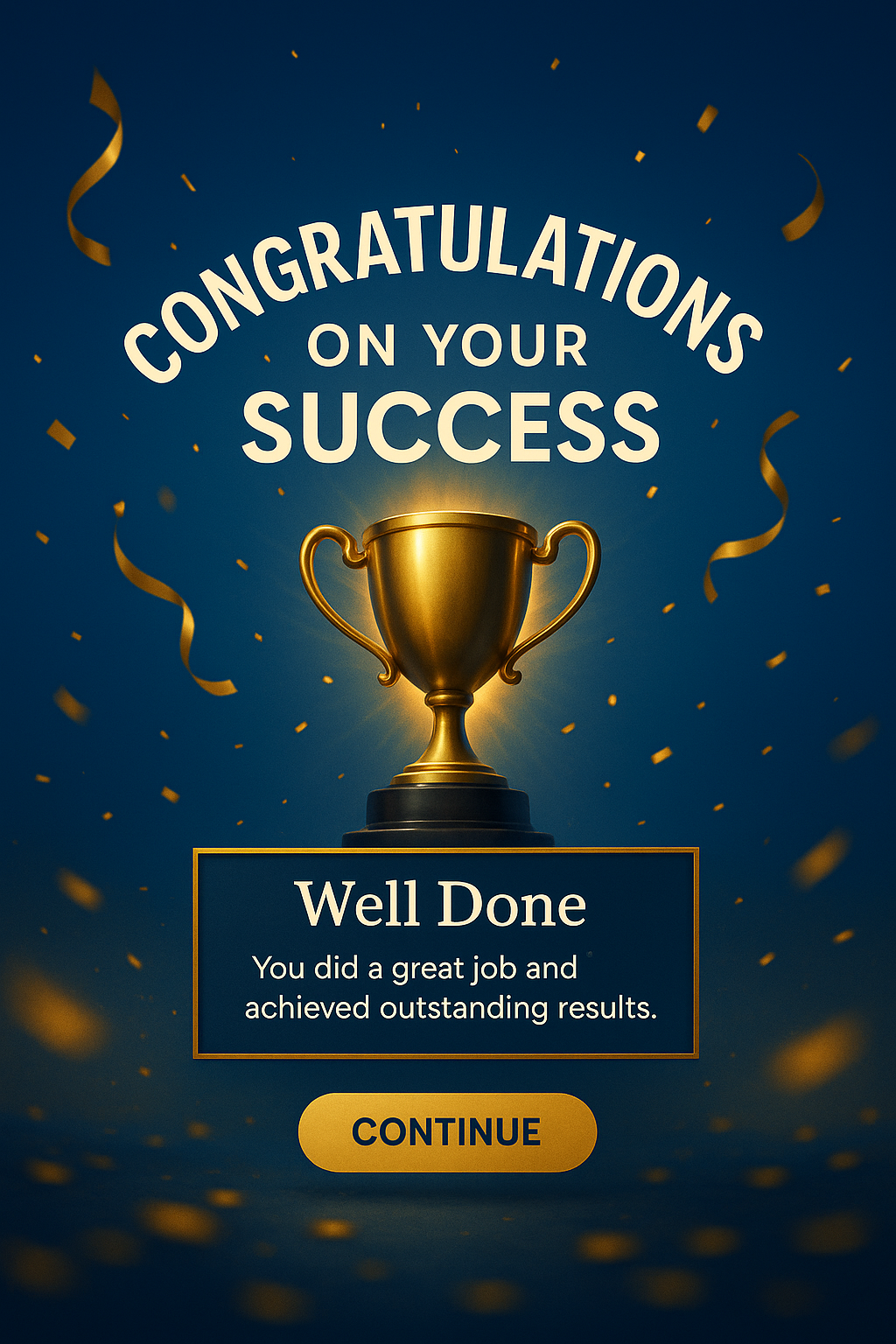 This is a congratulatory graphic featuring a trophy with a dark blue background and golden elements. It's ideal for celebrating achievements in a formal or playful manner.