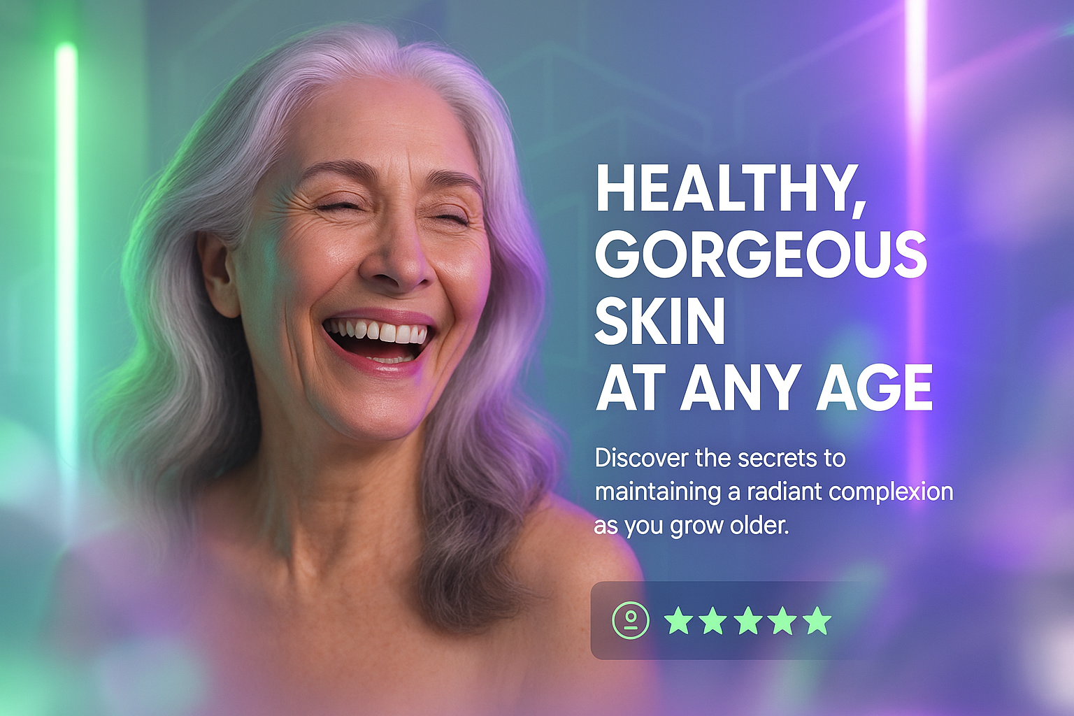 Engaging promotional graphic showcasing skincare secrets for all ages, featuring a smiling older woman and vibrant neon lights, ideal for wellness campaigns.