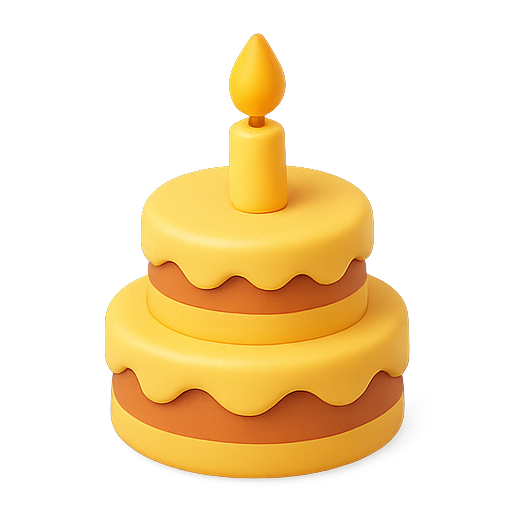 A playful 3D illustration of a two-tiered yellow birthday cake topped with a candle. This design is ideal for festive celebrations, suitable for invitations or party-related graphics.