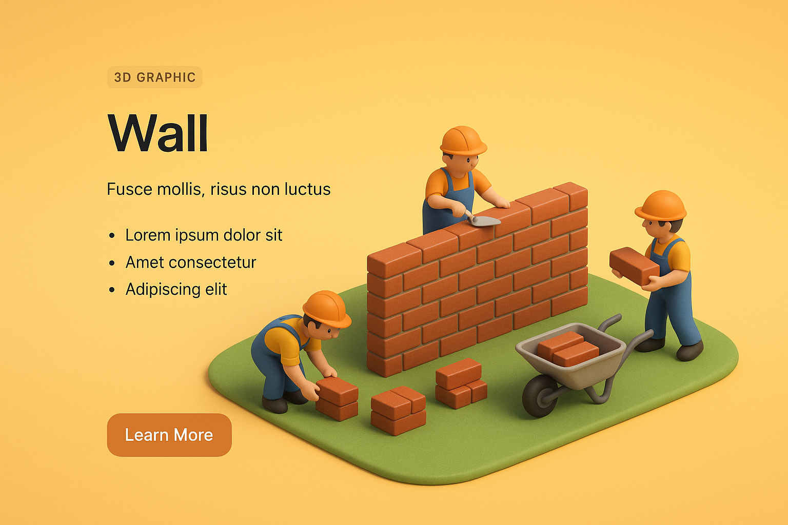 /Collection: /by davooda/Type: PNG/A vibrant 3D illustration depicting small workers constructing a wall. The scene features a gradient background and realistic textures, showcasing miniature figures engaged in building activities.