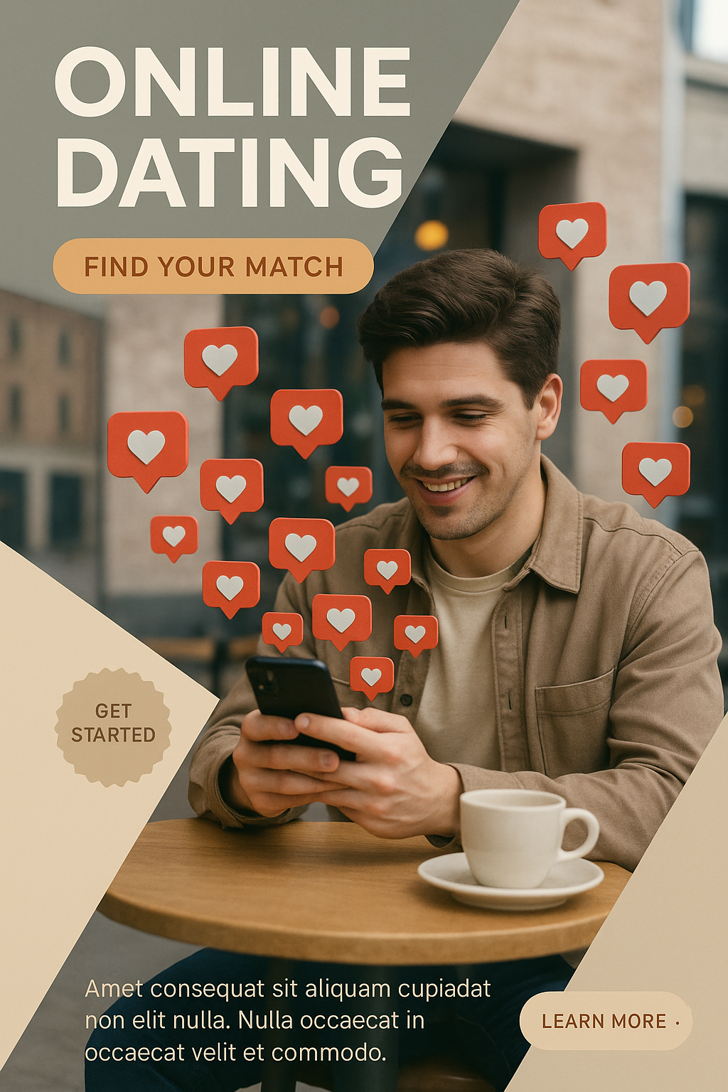 A young man sits in a cafe, engrossed in his phone, surrounded by colorful chat bubbles featuring heart icons. The warm atmosphere enhances the theme of online dating.