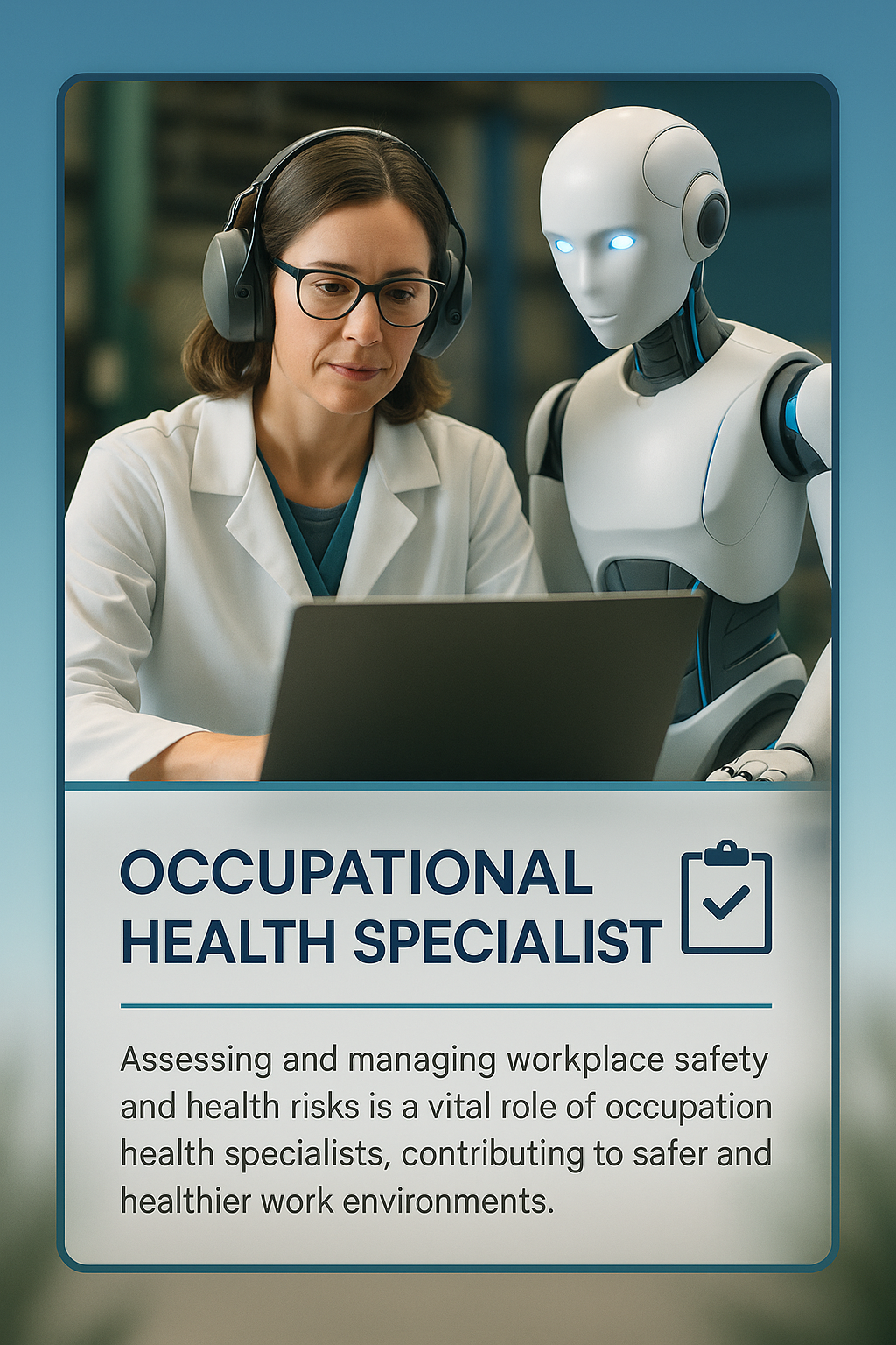 /Collection: /by davooda/Type: PNG/An Occupational Health Specialist works alongside a futuristic AI assistant, assessing workplace safety. The scene features a blended design with a professional layout.