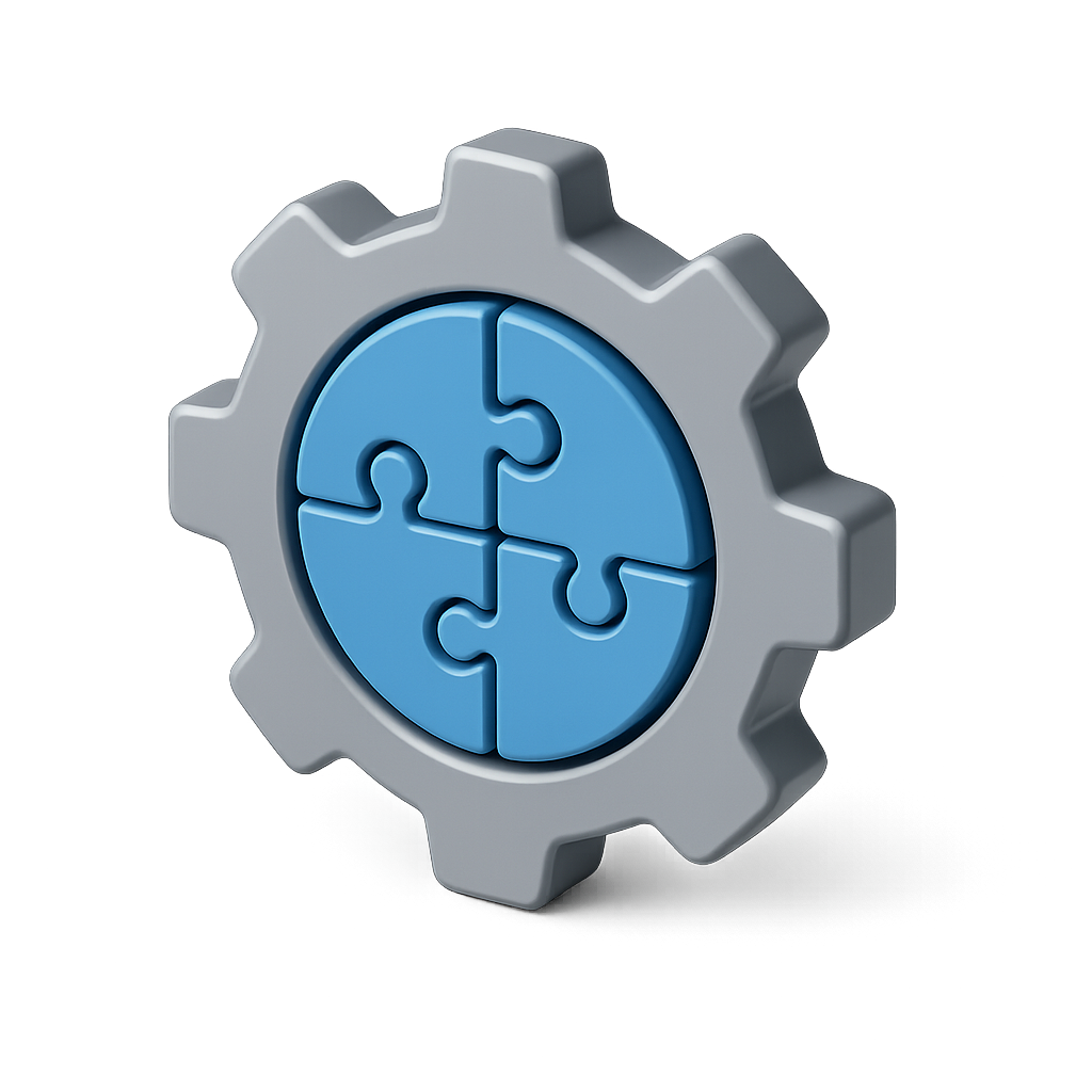 A 3D icon featuring a gear with puzzle pieces in the center, designed with a sleek, isometric view. The gear is gray with blue puzzle pieces, set against a subtle gradient background.