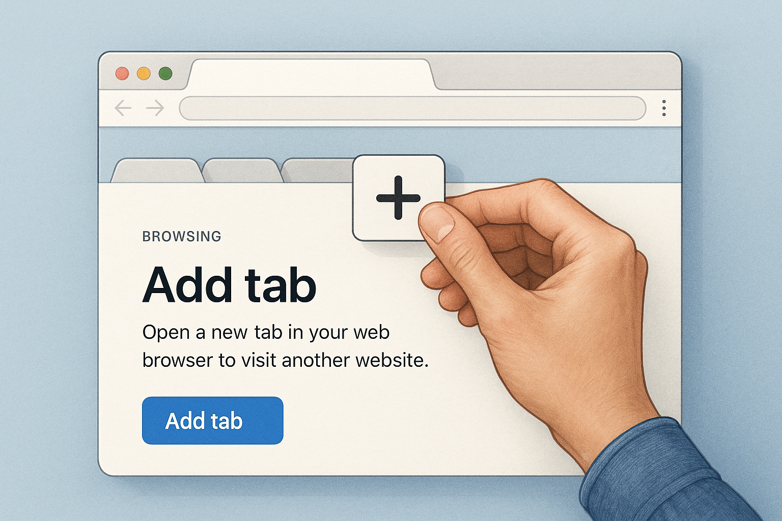A stylish web page design featuring the 'Add tab' functionality. The illustration shows a hand adding a new tab in a browser with clear text and an action button.