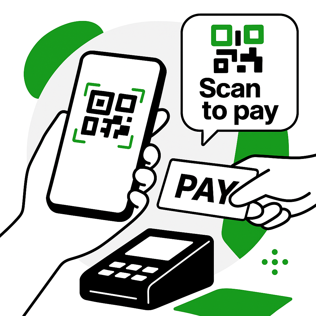 /Collection: /by davooda/Type: PNG/Vector illustration showcasing a digital payment process involving a QR code, smartphone, and payment terminal. Ideal for fintech marketing and educational content.