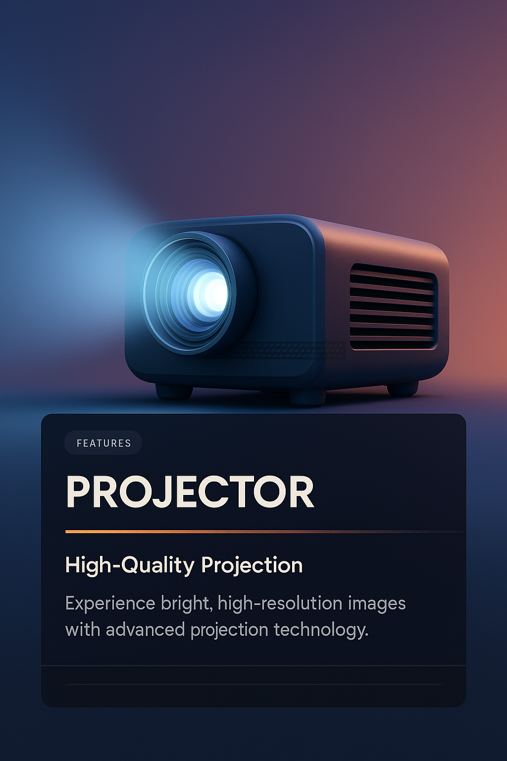 /Collection: /by davooda/Type: PNG/A sleek 3D illustration of a projector emitting bright light, set against a gradient background. The design features a dark information panel with text highlighting its advanced projection technology.