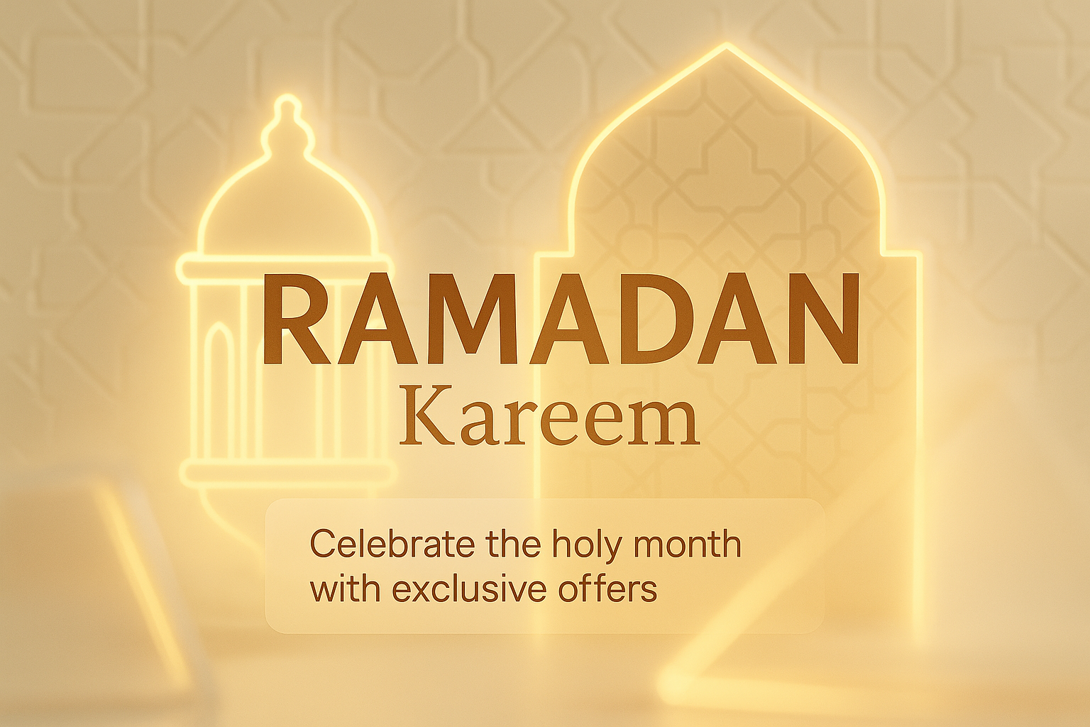 Stylish promotional banner for Ramadan featuring elegant design elements and soft lighting, ideal for marketing exclusive offers during the holy month.