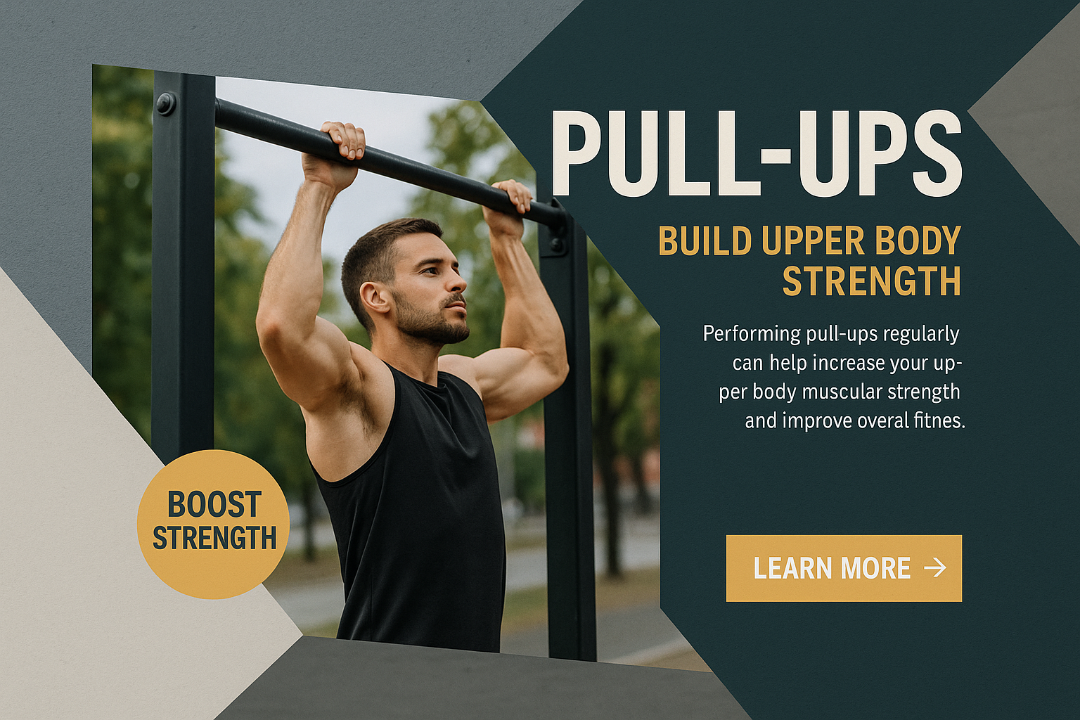 /Collection: /by davooda/Type: PNG/A man performs pull-ups, showcasing strength and fitness. The design includes a contrasting color scheme, an action button, and informative text to engage viewers.