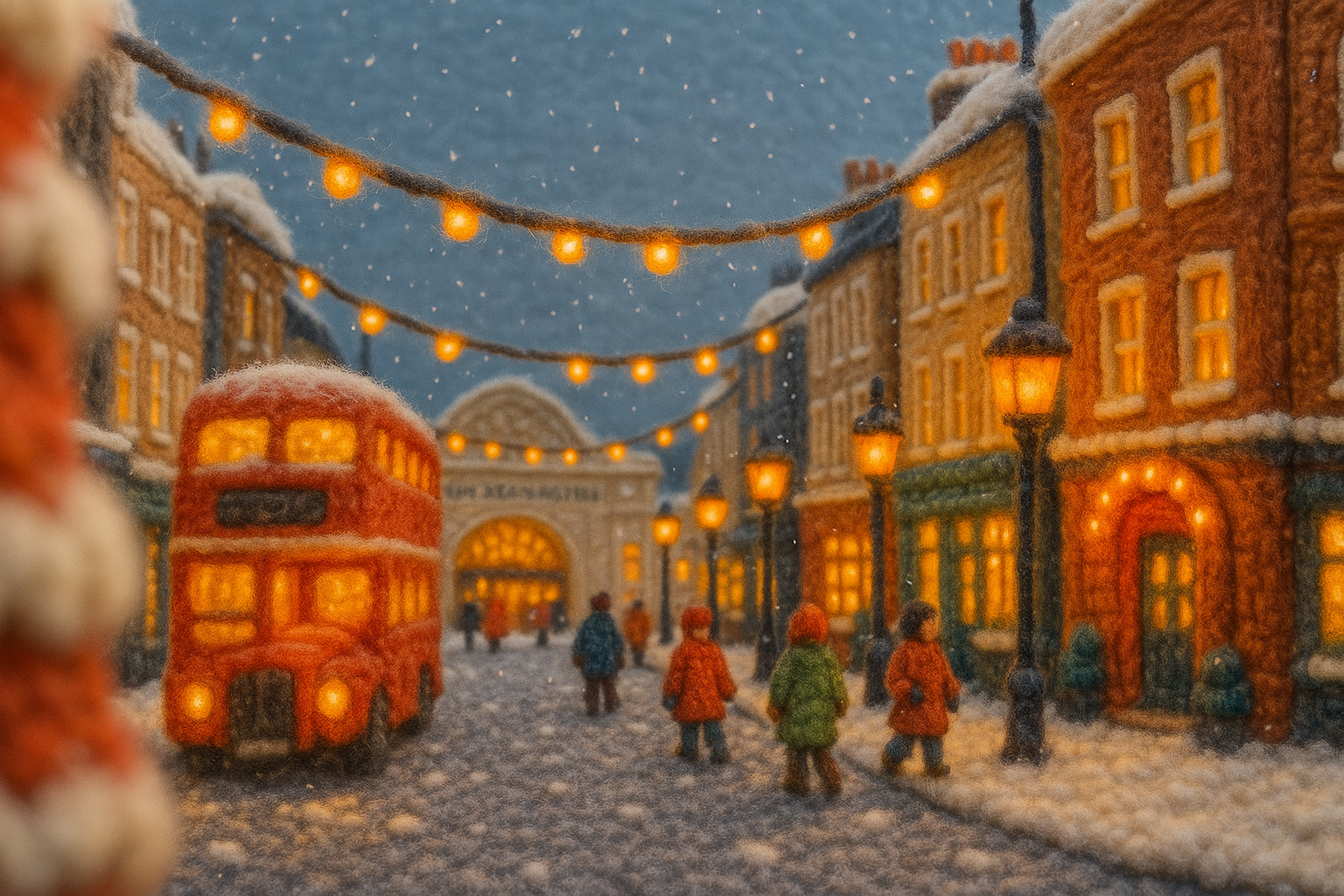 /Collection: /by davooda/Type: PNG/A charming 3D depiction of South Kensington, London, crafted to resemble woolen threads. It features a snowy street scene with warm lights, a double-decker bus, and tiny figures, creating a festive atmosphere.