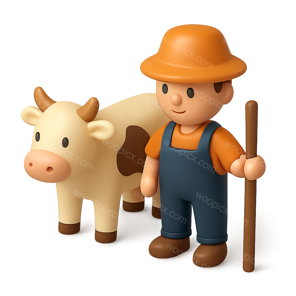 A charming 3D icon depicting a cowherd character alongside a friendly cow. The design features a warm color palette with a transparent background, showcasing a playful, volumetric style.