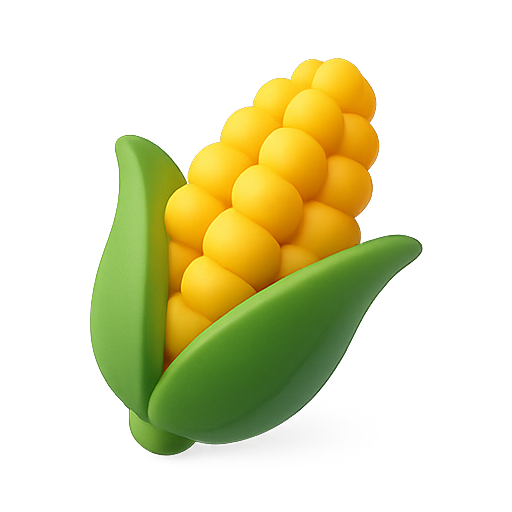 A vibrant 3D rendering of a corn cob with a cartoonish style, featuring bright yellow kernels and green husks. Ideal for food-related graphics, animations, or playful branding.