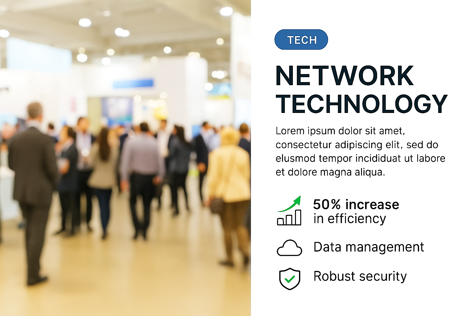 Informative graphic showcasing network technology advancements, featuring a blurred background of a tech event, ideal for presentations and marketing.