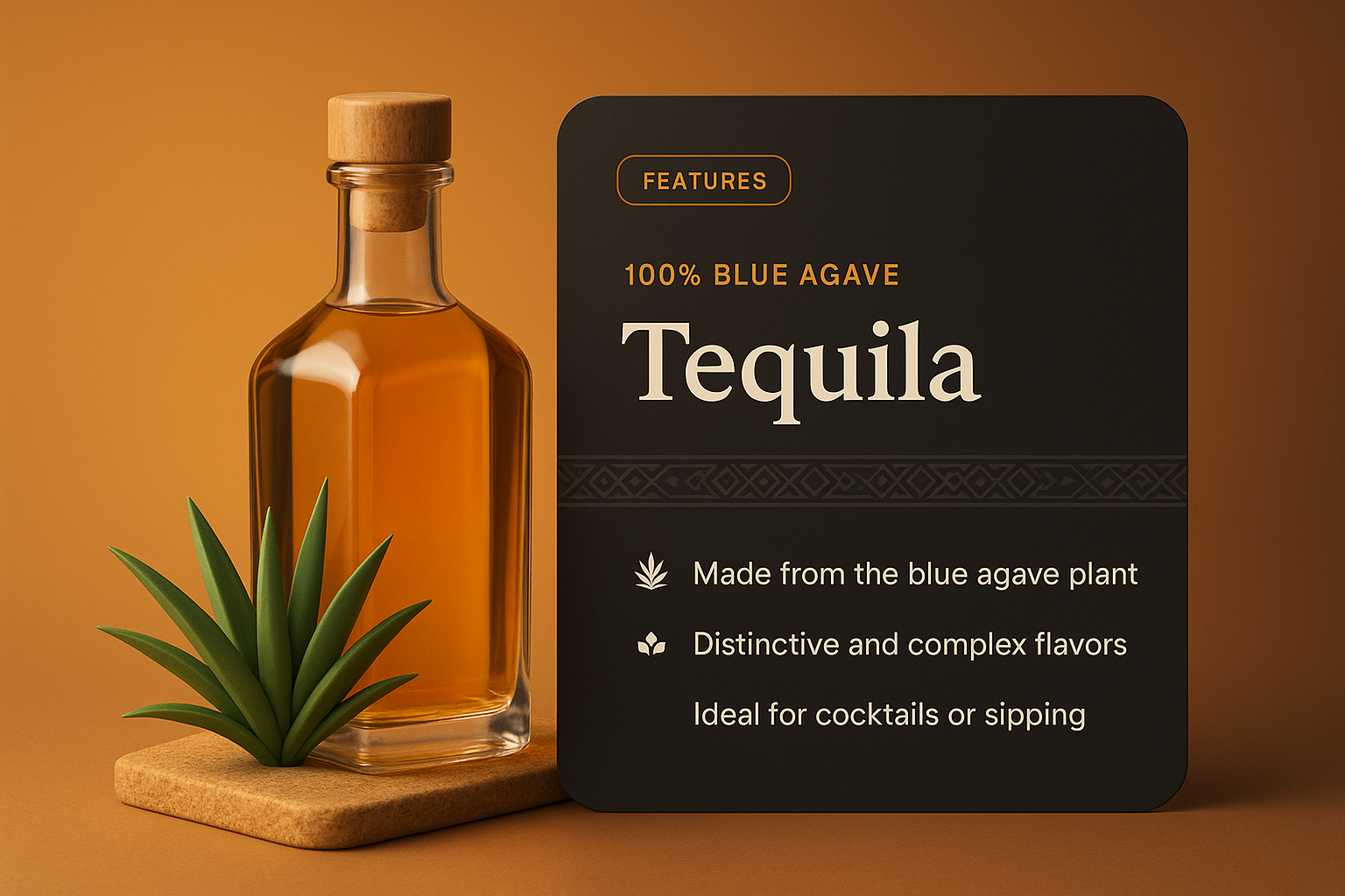 A visually appealing 3D illustration showcasing a tequila bottle made from blue agave. Accompanied by a dark feature block detailing its characteristics.