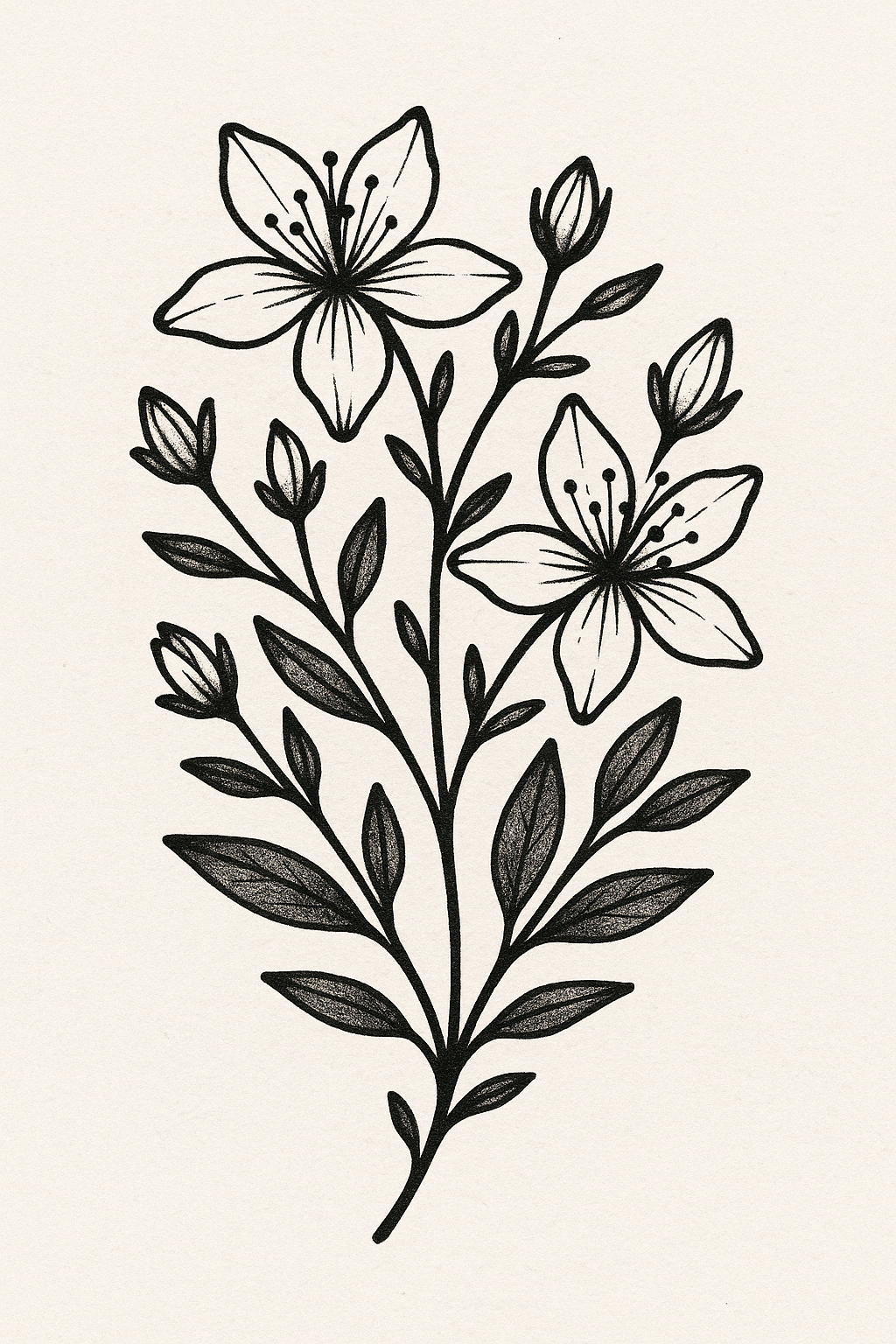 Black and White Floral Illustration with Delicate Flowers and Leaves
