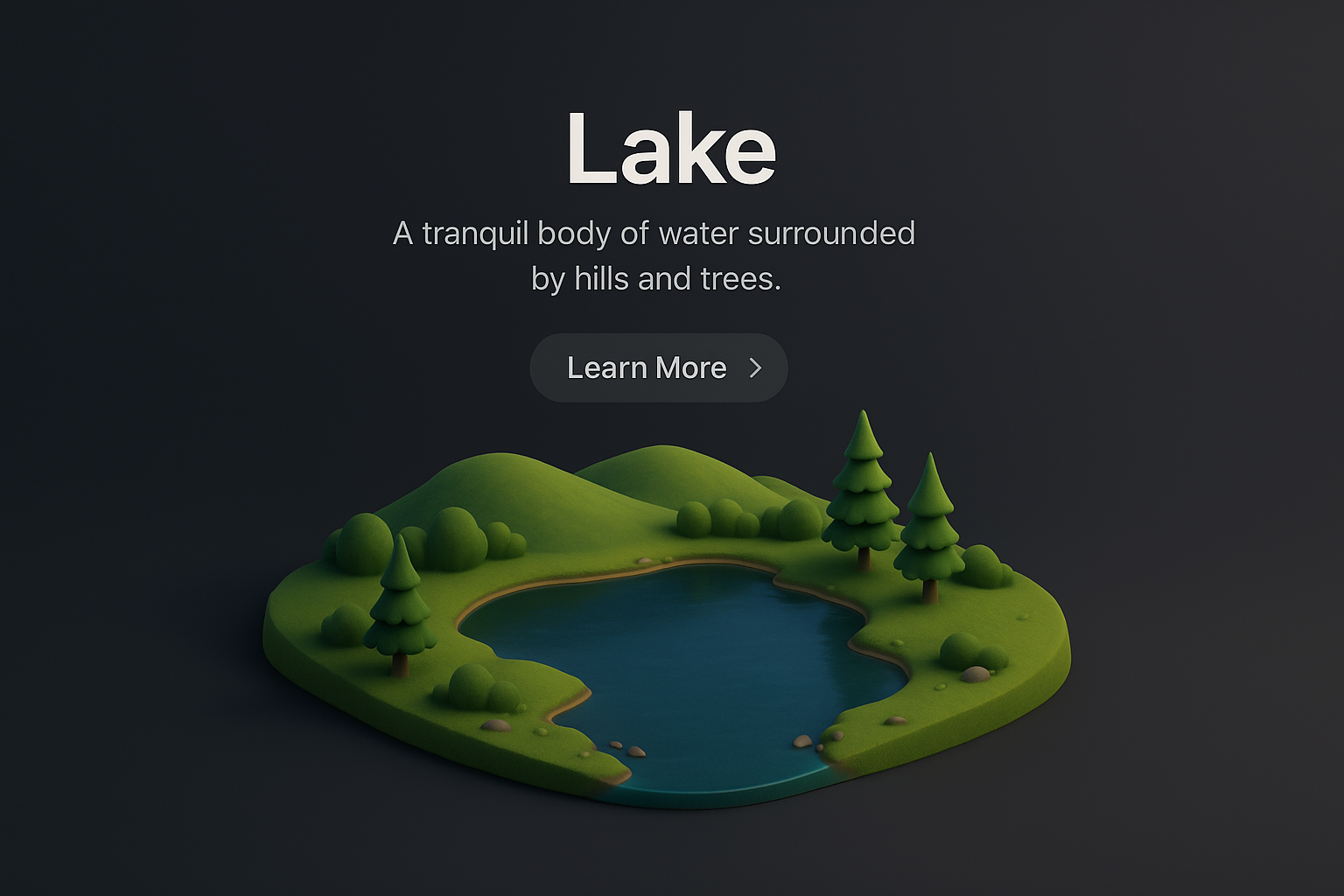 A beautifully designed 3D scene depicting a tranquil lake surrounded by lush hills and trees, displayed against a dark gradient background.