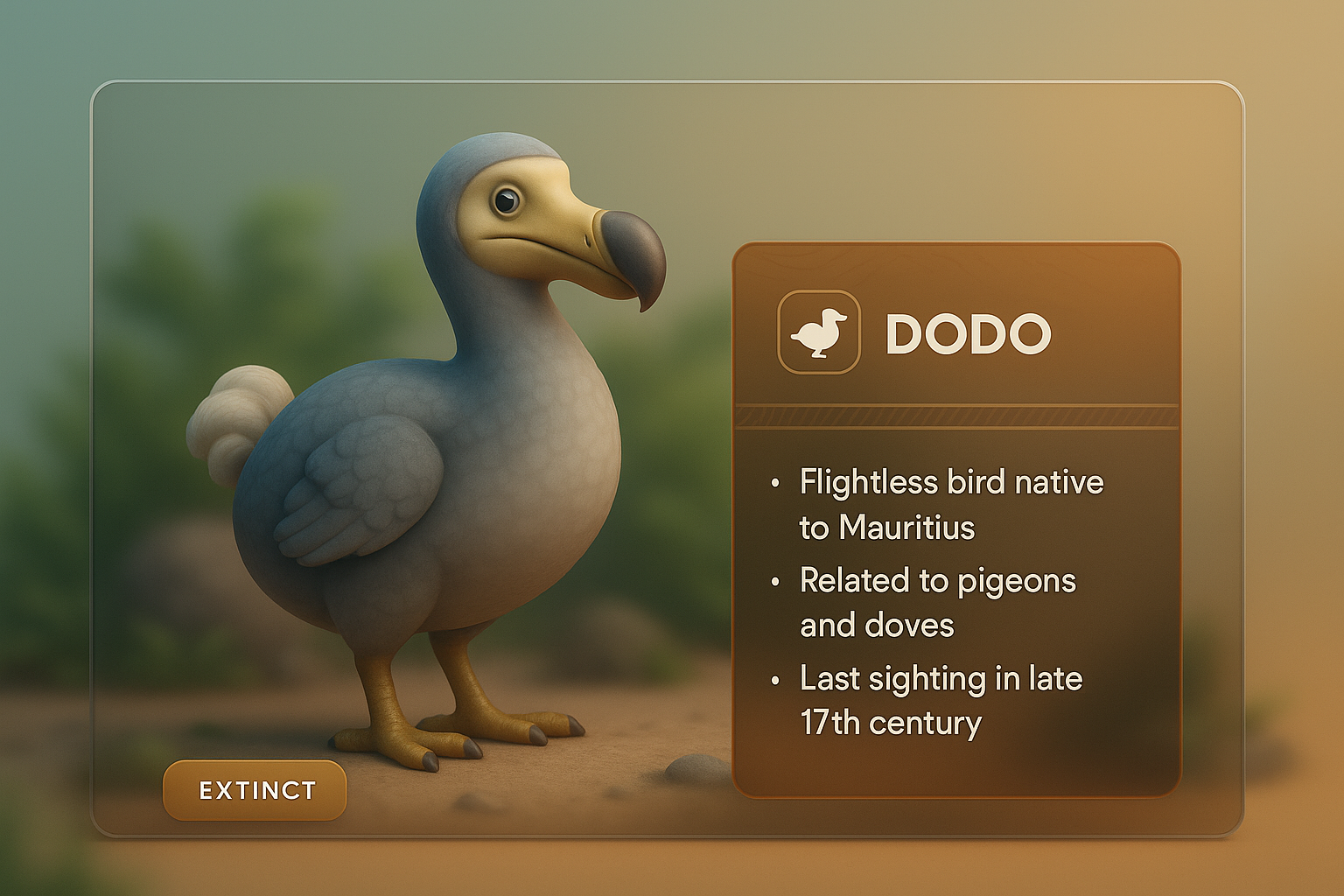 /Collection: /by davooda/Type: PNG/This image features a 3D illustration of a dodo bird, an extinct species native to Mauritius, set against a soft gradient background. The design includes informative text about the bird's characteristics and history.