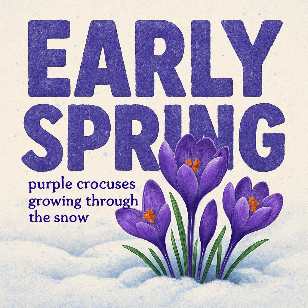 Charming illustration depicting purple crocuses emerging from snow, symbolizing the arrival of spring. Ideal for seasonal promotions or nature-themed projects.