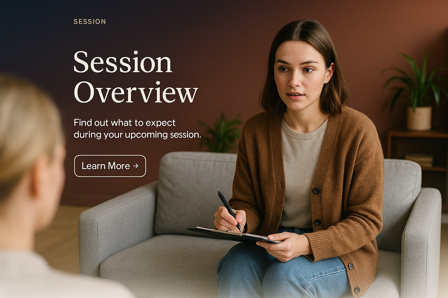 A modern web design layout showcasing a session overview. It features a person seated on a couch, engaged in discussion, with a clear call-to-action button.