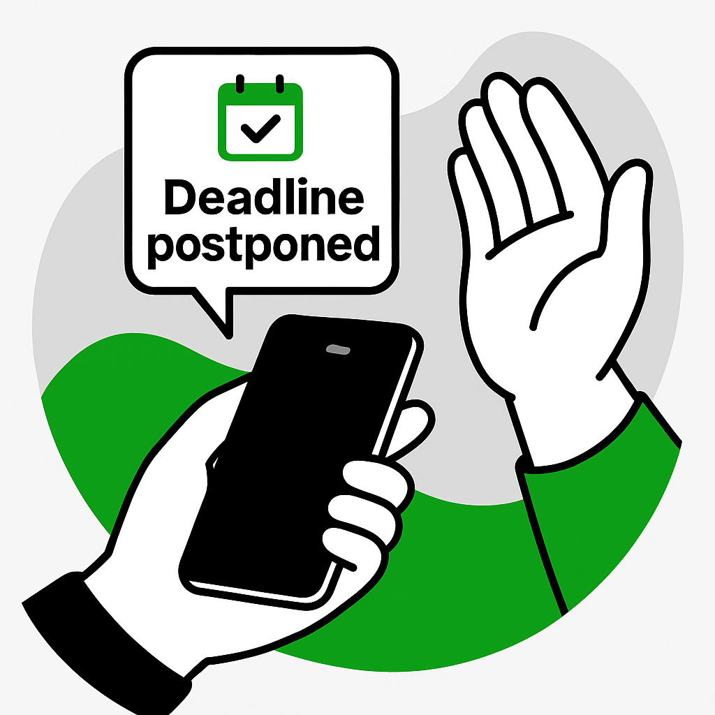 /Collection: /by davooda/Type: PNG/A digital illustration showing a hand holding a smartphone with a notification about a postponed deadline. The design is modern and minimalistic, suitable for digital communication.