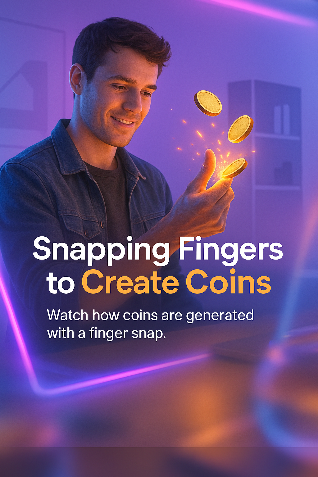 /Collection: /by davooda/Type: PNG/A visually engaging promotional image showcasing a person generating coins with a finger snap, designed to attract attention and illustrate a magical concept in a modern style.