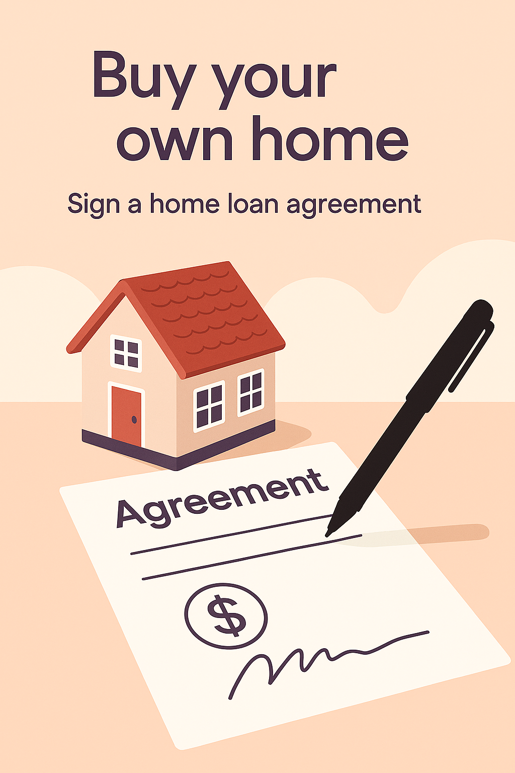A modern illustration depicting a home loan agreement signing with a house and a pen, ideal for real estate and financial marketing materials.
