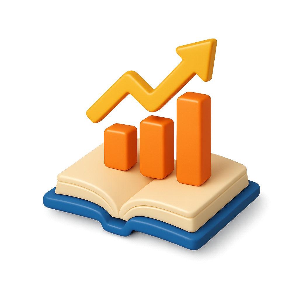 A colorful 3D icon featuring a book with an upward graph symbolizing success. The design includes volumetric shapes in orange and blue on a transparent background.