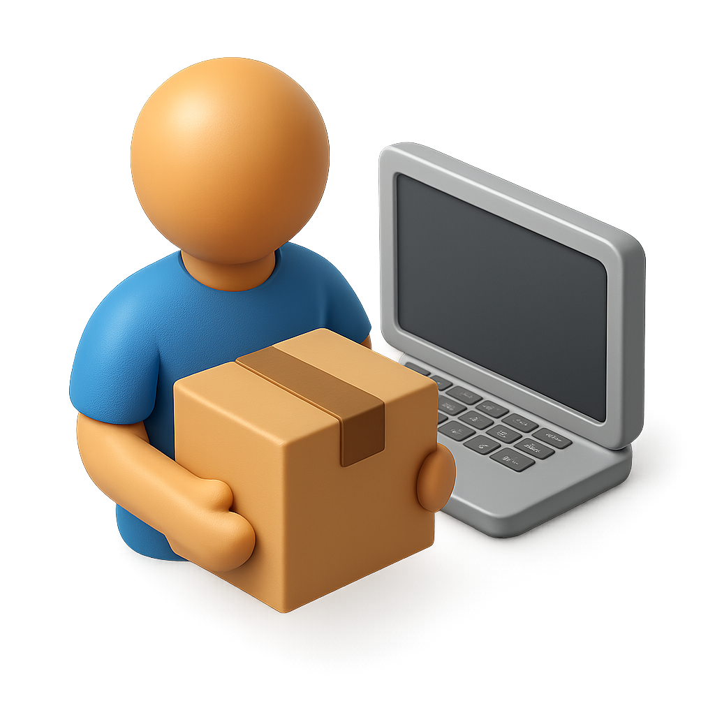 /Collection: /by davooda/Type: PNG/A stylized 3D icon depicting a person with a round head and blue shirt, holding a brown box beside a gray laptop computer. The design features a three-quarter view with a volumetric feel.