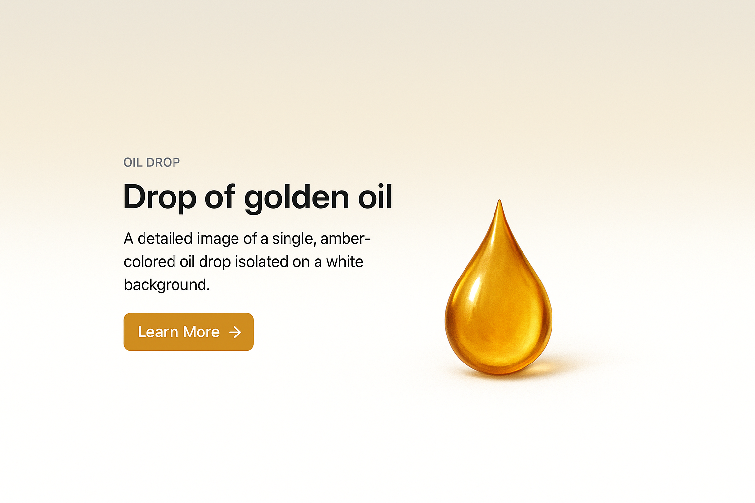 A detailed 3D illustration of a golden oil drop on a smooth gradient background, complemented by minimal text and a call-to-action button.