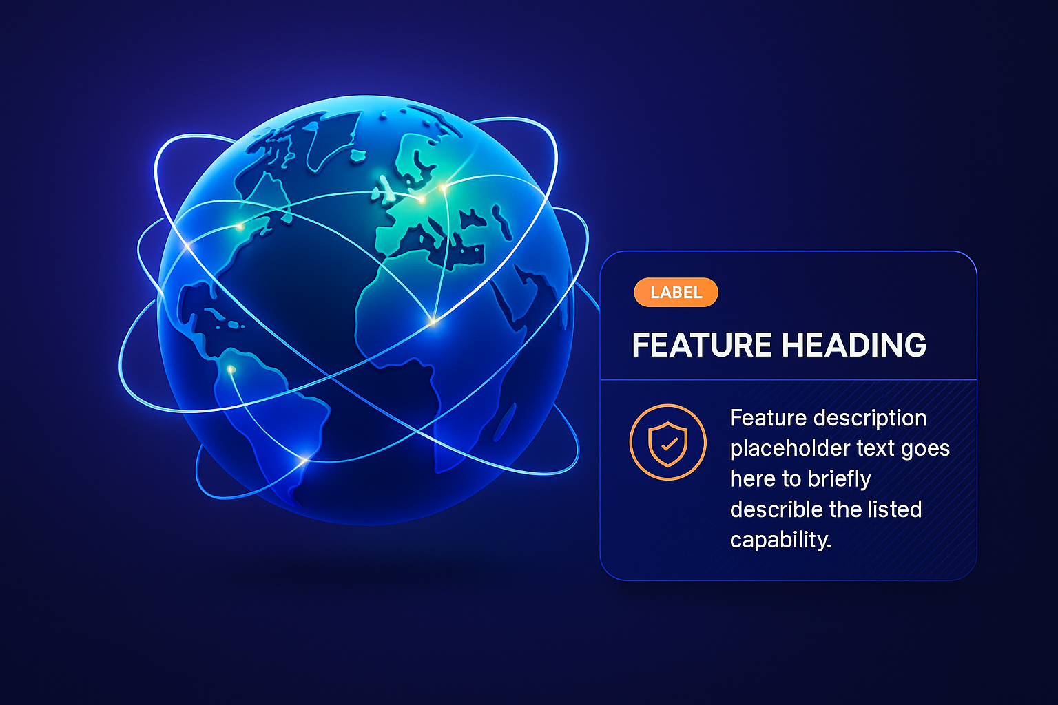 /Collection: /by davooda/Type: PNG/A visually striking 3D illustration of Earth with glowing connections, set against a dark gradient background. Includes a feature block with a heading and description.