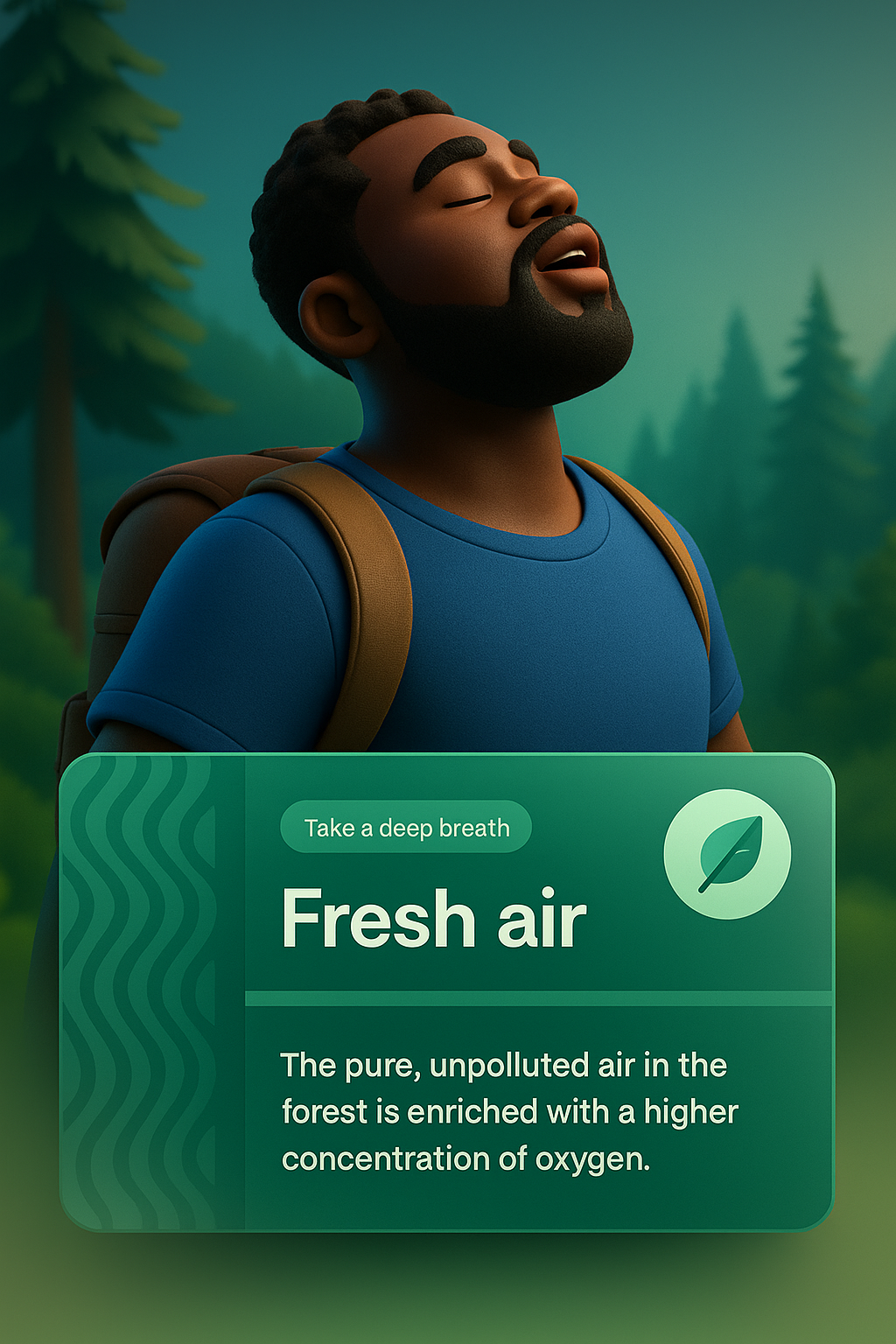 A black man stands in a vibrant forest, inhaling deeply with a serene expression. The image features a stylish text block overlay that highlights the benefits of fresh air.