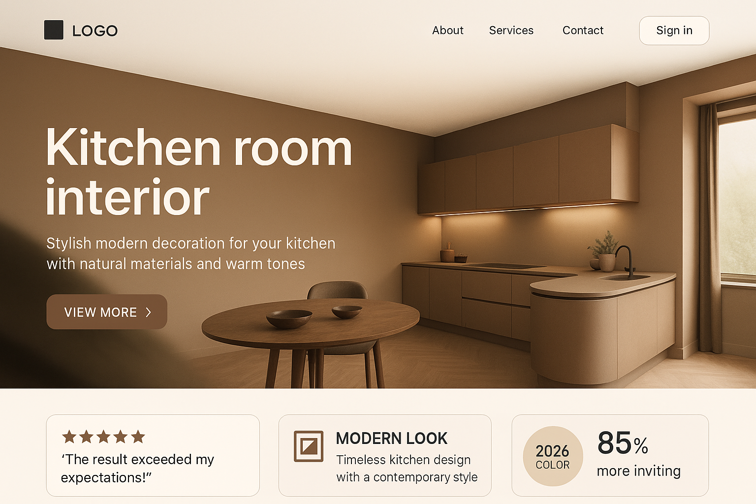 A contemporary kitchen interior featuring warm mocha tones and modern decor. Includes visual elements like a logo, action buttons, and customer testimonials.
