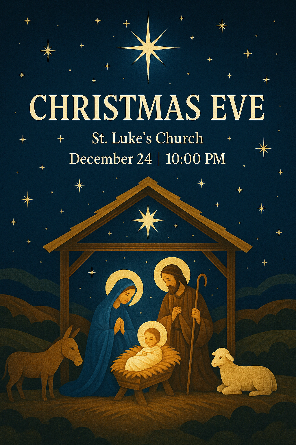 /Collection: /by davooda/Type: PNG/Festive announcement poster for a Christmas Eve service featuring a serene nativity scene with warm colors, suitable for church events and holiday celebrations.