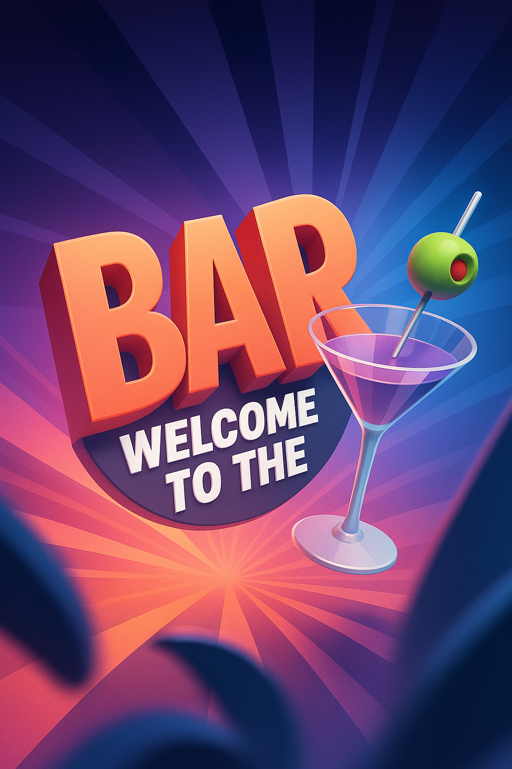A vibrant 3D illustration presents a cocktail glass with an olive, set against a dynamic gradient background. The title 'BAR' stands out boldly, enhancing the inviting atmosphere.