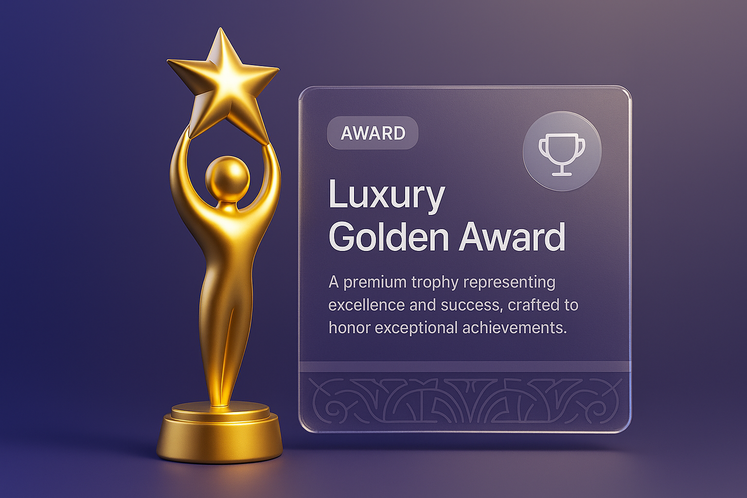 A stunning 3D golden trophy depicting a figure holding a star, accompanied by a glass-like award card. The background features a smooth gradient, enhancing the trophy's elegance.