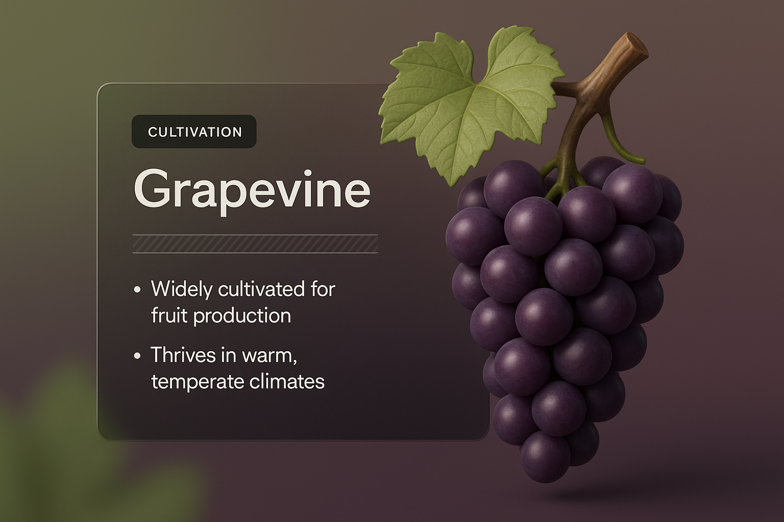 /Collection: /by davooda/Type: PNG/A beautifully crafted 3D illustration of a grapevine cluster, accompanied by an informative overlay that includes cultivation details and design elements. The background features a smooth gradient.