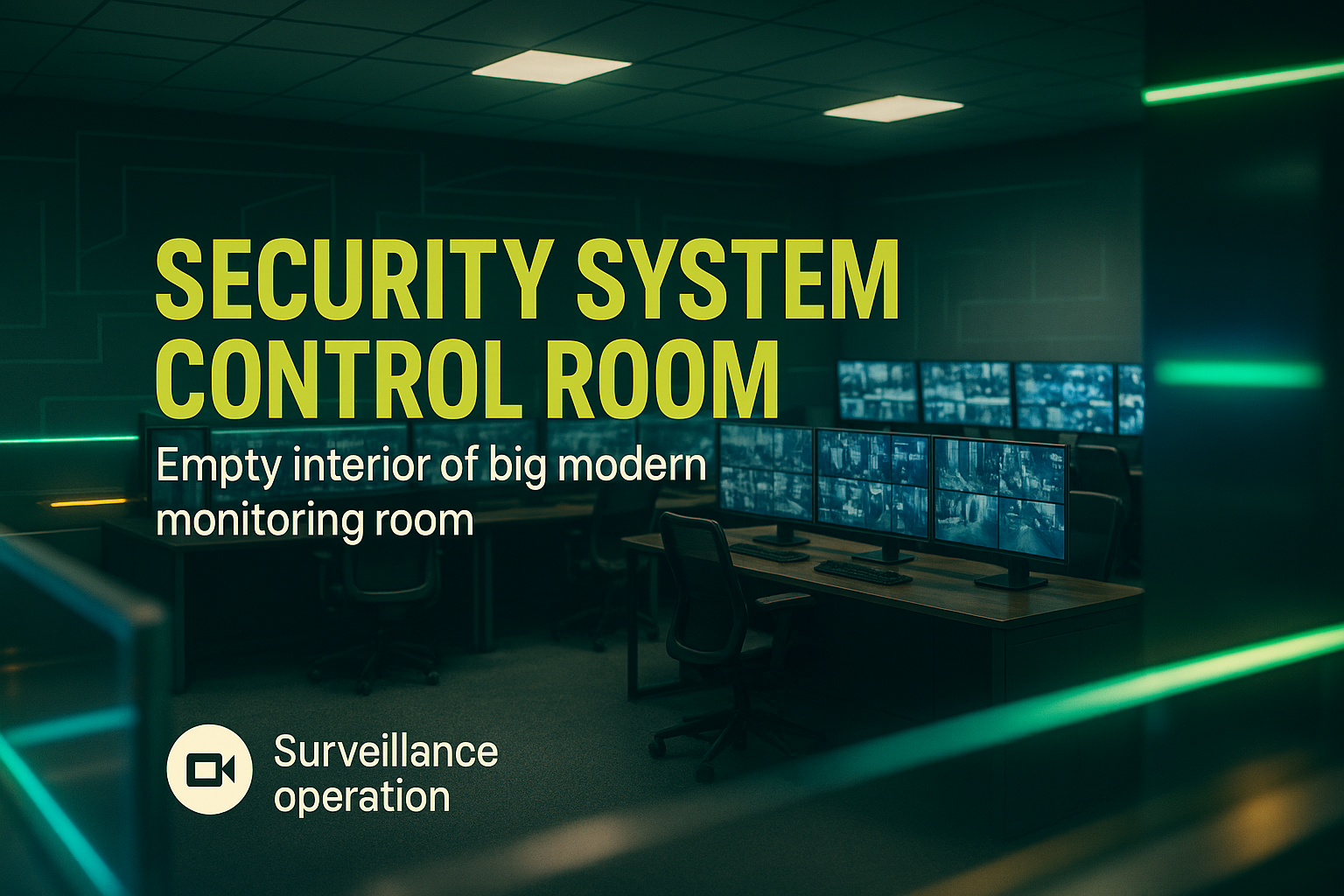 An empty, contemporary security system control room featuring multiple monitors, ideal for showcasing surveillance operations in tech-related content.