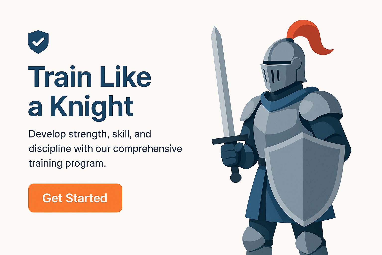 /Collection: /by davooda/Type: PNG/A clean, two-column layout focusing on product promotion. The left column features bold typography and a call-to-action button, while the right showcases a stylized knight illustration, emphasizing strength and discipline.