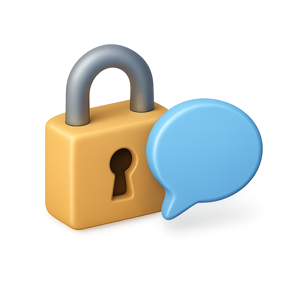 A visually appealing 3D lock icon paired with a blue speech bubble. The design features a metallic handle and a golden lock body, set against a gradient background.