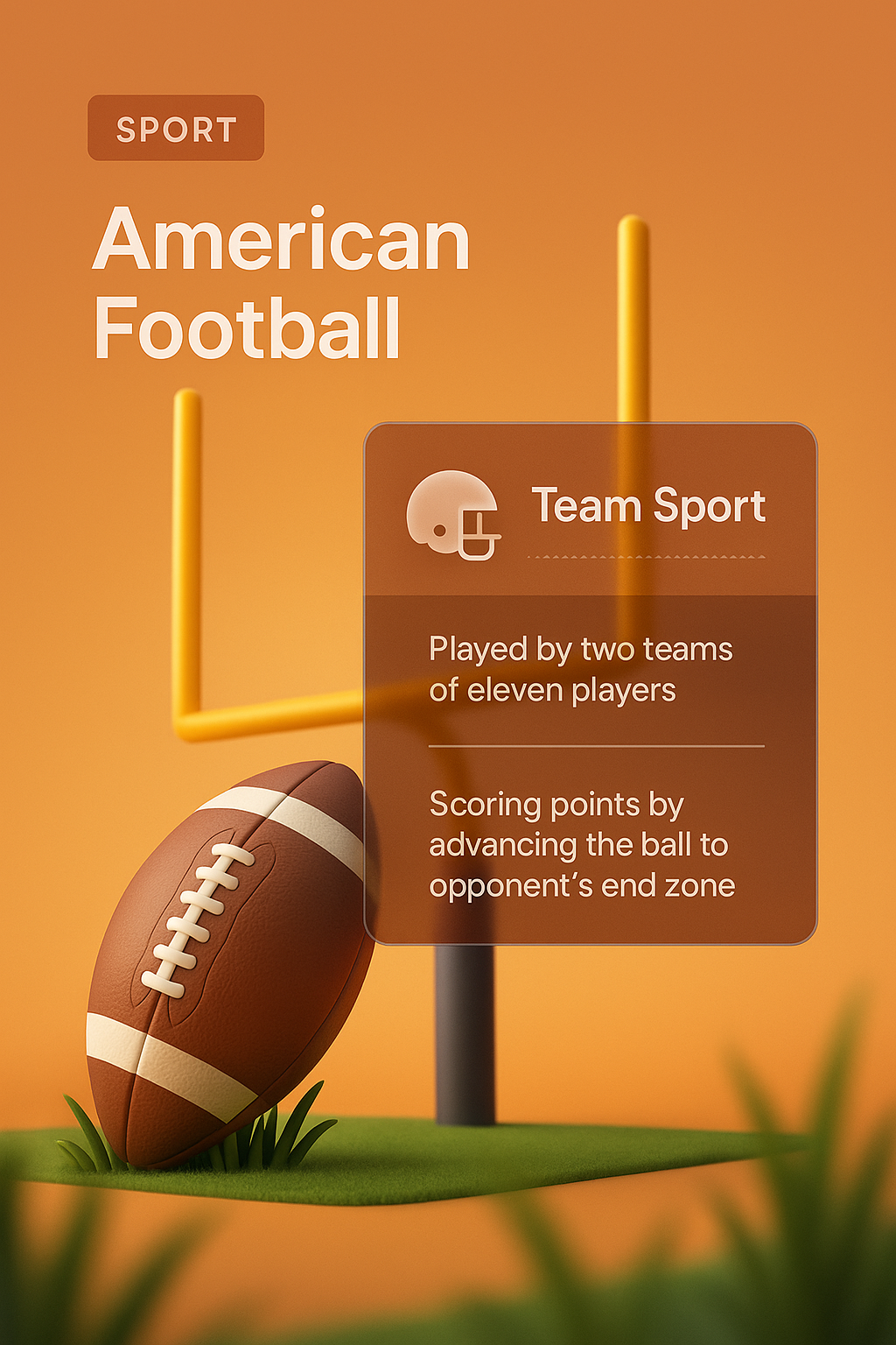 /Collection: /by davooda/Type: PNG/A visually appealing design for American football featuring a 3D illustration of a football and goalposts. The layout includes informative text blocks with a transparent glass effect.