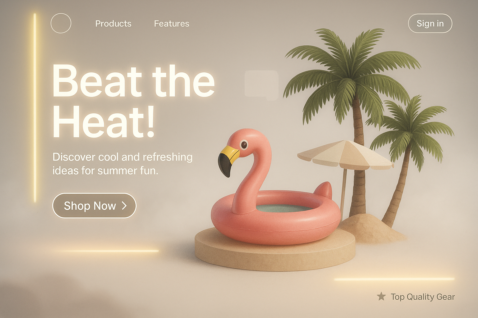 /Collection: /by davooda/Type: PNG/A vibrant landing page design featuring a pink flamingo inflatable pool, palm trees, and a beach umbrella. The layout includes a bold headline, call-to-action button, and product highlights, all in a bright, inviting atmosphere.