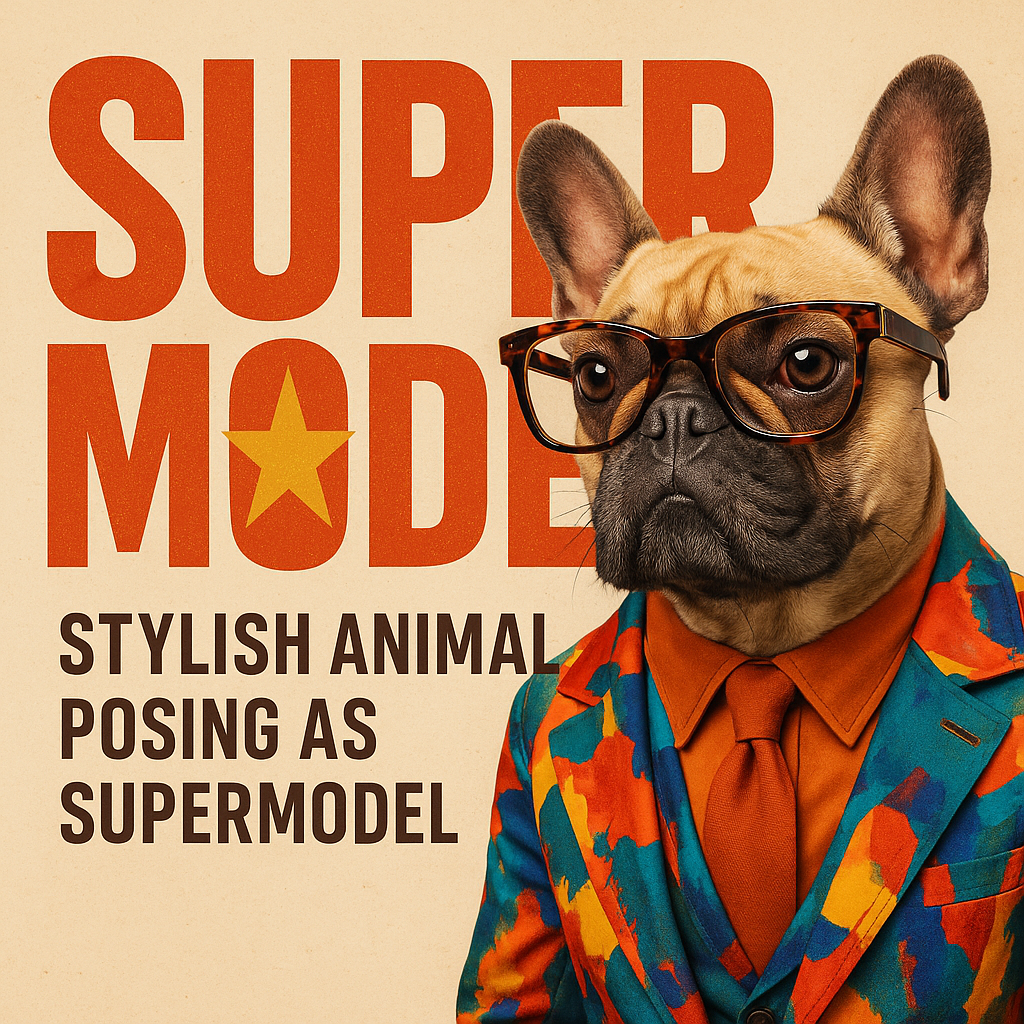 A whimsical and humorous portrait of a dog dressed as a supermodel, wearing glasses and a colorful suit. Perfect for social media or pet-related marketing.